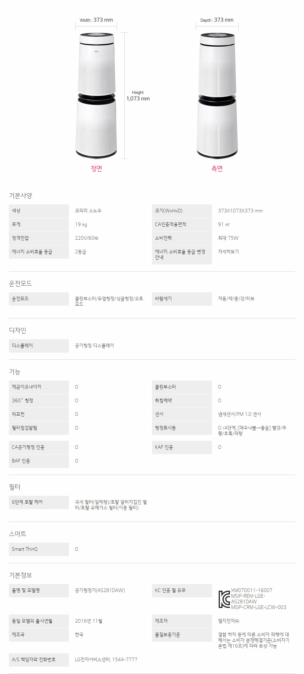 LG공기청정기(AS281DAW) / CA인증적용면적 : 91㎡ / 색상 : 크리미 스노우 / 크기(WxHxD) : 373X1073X373 mm / 무게 : 19 kg / 정격전압 : 220V/60㎐ / 소비전력 : 최대 75W