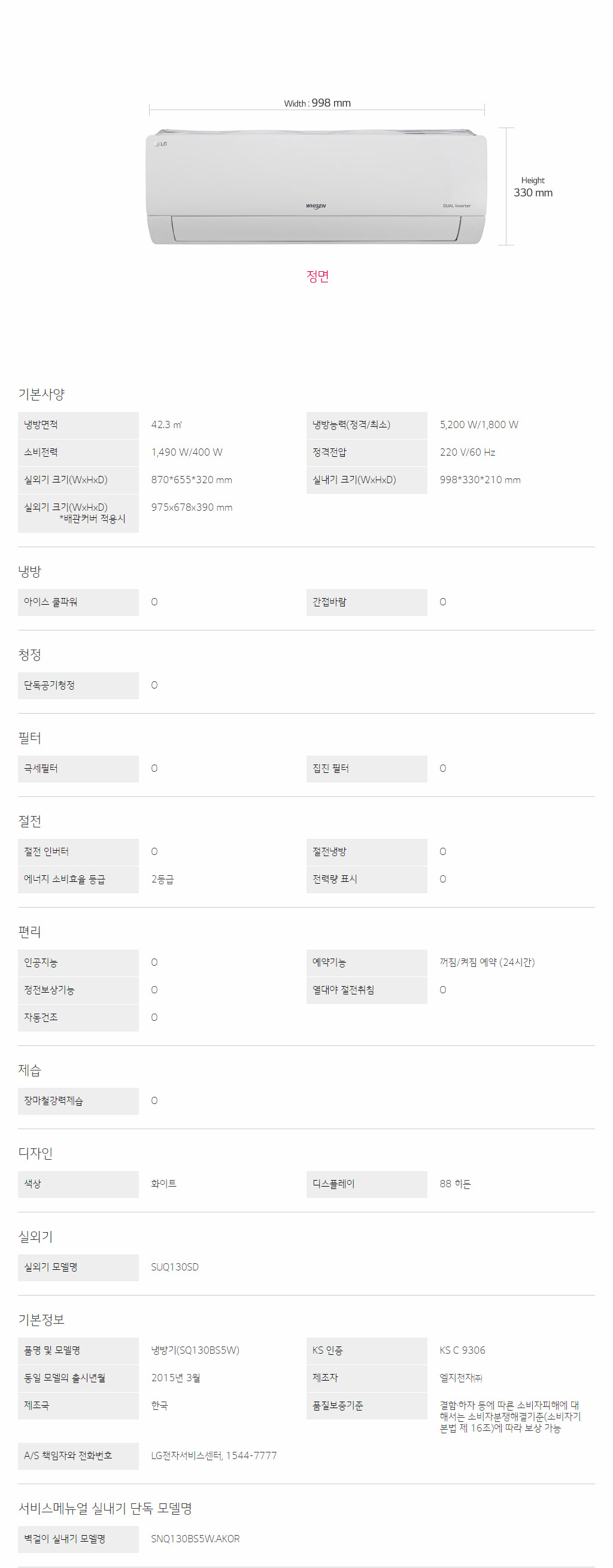 SQ130BS5W / 냉방면적 : 42.3 ㎡ / 냉방능력(정격/최소) : 5,200 W/1,800 W / 소비전력 : 1,490 W/400 W / 정격전압 : 220 V/60 Hz / 실내기 크기(WxHxD) : 998x330x210 mm / 실외기 크기 (WxHxD) : 870x655x320 mm / 실외기 크기(배관커버 적용시) : 975x678x390 mm /색상 : 화이트 / 디스플레이 : 88 히든